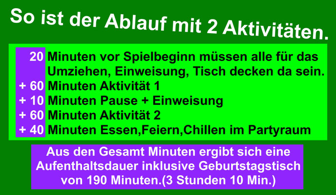 Wenn ihr die Preise zusammenrechnet, wisst ihr sofort was der ganze Geburtstag kostet. Das bedeutet: Aktivität 1 + Aktivität 2 = Gesamtpreis.
