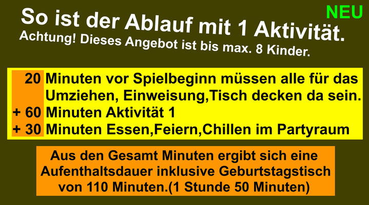 Weil es nur 4 Geburtstage pro Tag gibt, solltet ihr bei einem Anruf mindestens 3 verschiedene Termine nennen können, wann ihr feiern möchtet bzw. alle eingeladenen Gäste Zeit haben. Viele Kunden buchen schon sehr weit im Voraus.