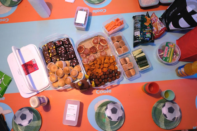 Ihr könnt Zuhause alles vorbereiten und es dann einfach mitbringen. Dazu zählen natürlich Donuts, Chips, Süßigkeiten, Getränke und zum Beispiel kleine Würstchen, belegte Brötchen, Obst, Gemüse, kleine Burger, selbstgemachte Pizza oder Pizzaschnecken und alles was Euch sonst noch so einfällt ;-) Achtung!! Fingerfood mögen viele Kinder nicht!!